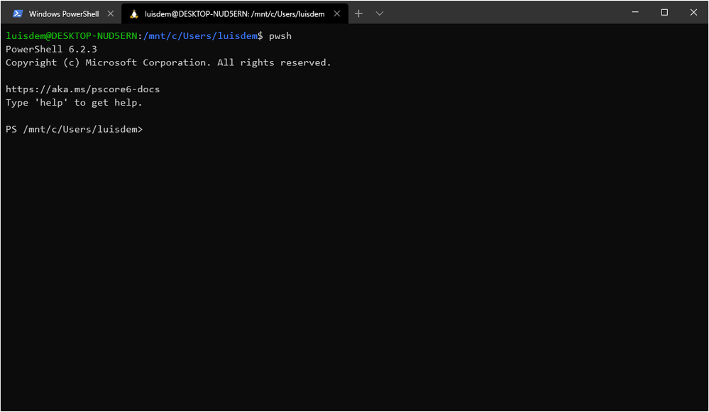 After reopening the Windows Terminal, type pwsh to launch PowerShell Core: