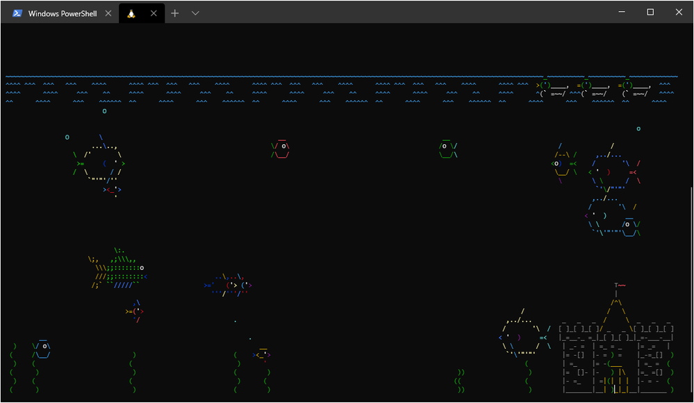 Now, on the right pane, type Alt+Shift+- to create a new panel horizontally, type wsl to switch to Linux and type asciiquarium to start that app: