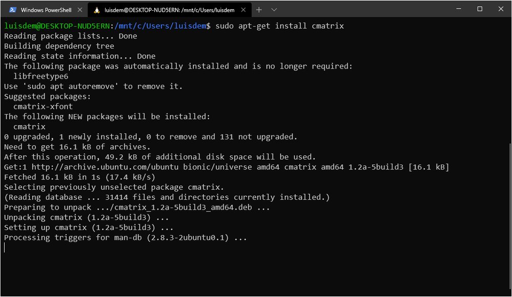This step was used in my Ignite demo to demonstrate that WSL is a real Linux edition that it can run Linux apps. The ASCIIQuarium, CMatrix and Cacafire apps will be used in the next session to demonstrate that it is possible to split the Windows Terminal in different sessions.