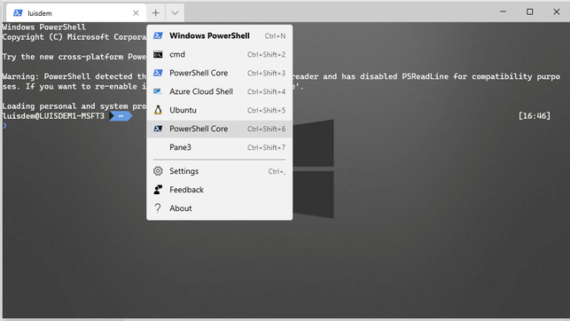 You can also launch PowerShell Core from the shell list available in the tab menu: