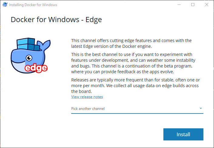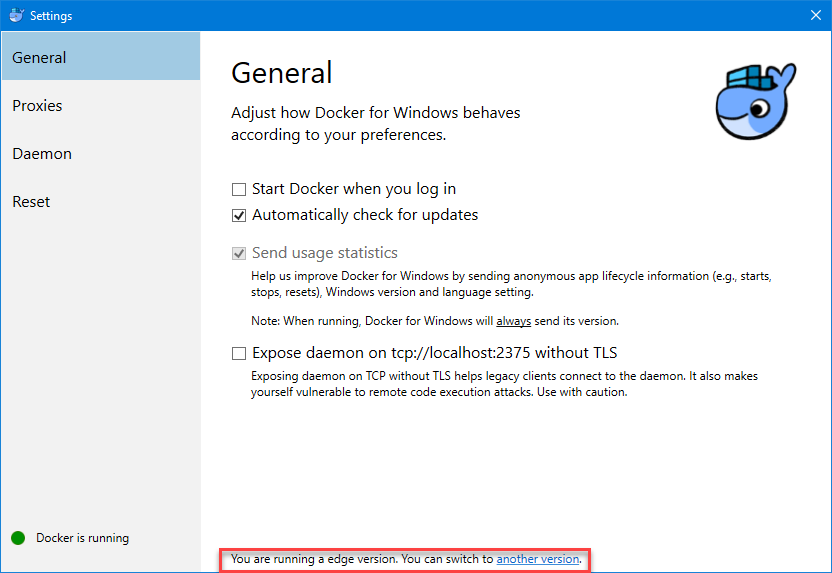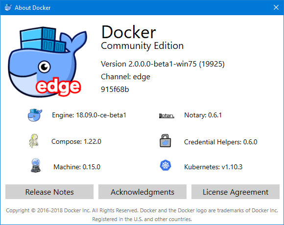 Once the installation is completed, you'll be able to start playing with the last beta version of Docker. At the time of writing, its version number is 2.0.0.0-beta1 , which includes version 18.09.0-ce-beta1 of the Docker Engine.