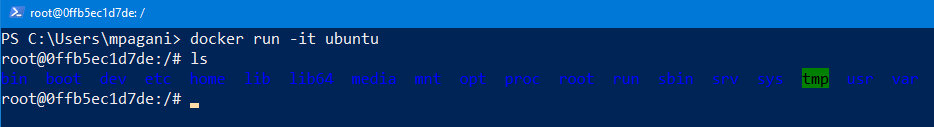 This time we can properly connect to the terminal and see the lists of files inside the container using UNIX commands: