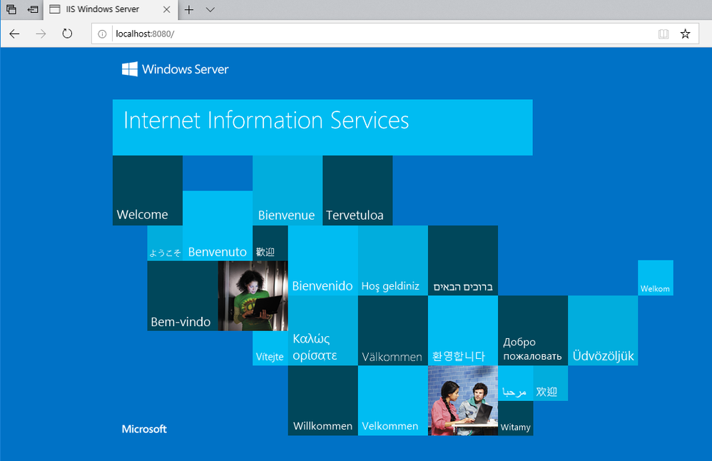 The image will be pulled from Docker Hub, then Docker will spin a new container for it. By using the -p parameter we're exposing the internal 80 port to the 8080 port of the host. If we open with the browser the URL http://localhost:8080 we will see the default IIS page: