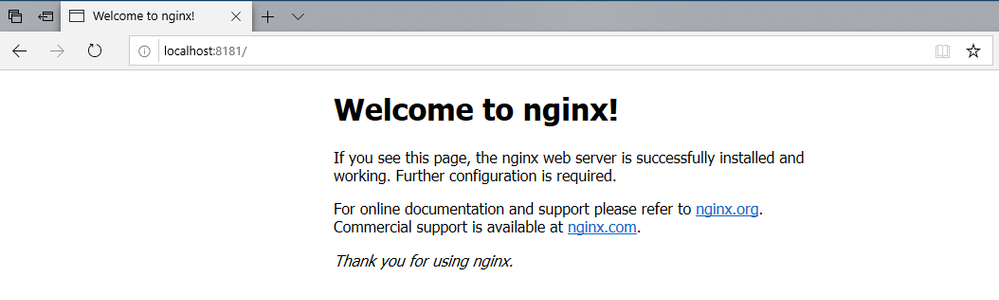 The command is the same as the previous one. We have just changed the image to use ( nginx ) and the port where to expose the web server to 8181, since 8080 is already used by IIS. Now point your browser to http://localhost:8181 to see the default NGINX page.