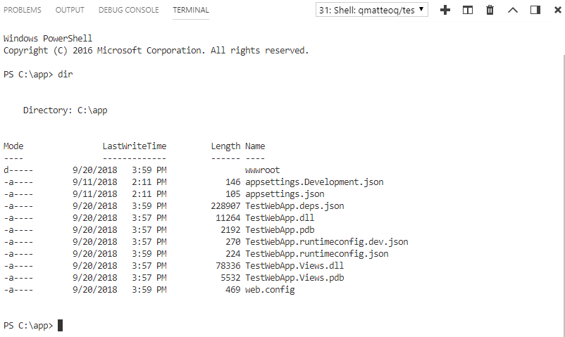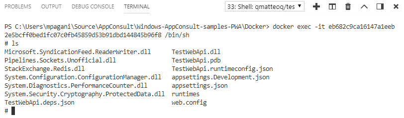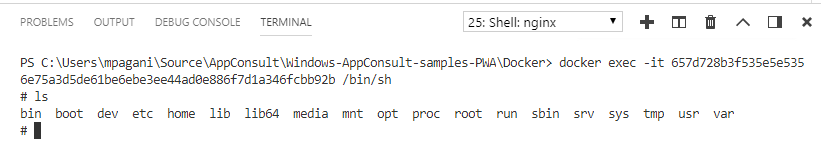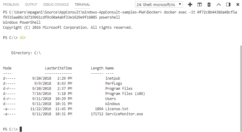 Now right click on the microsoft/iis container and choose Attach Shell . Under the hood, Visual Studio Code will perform the following command for you: