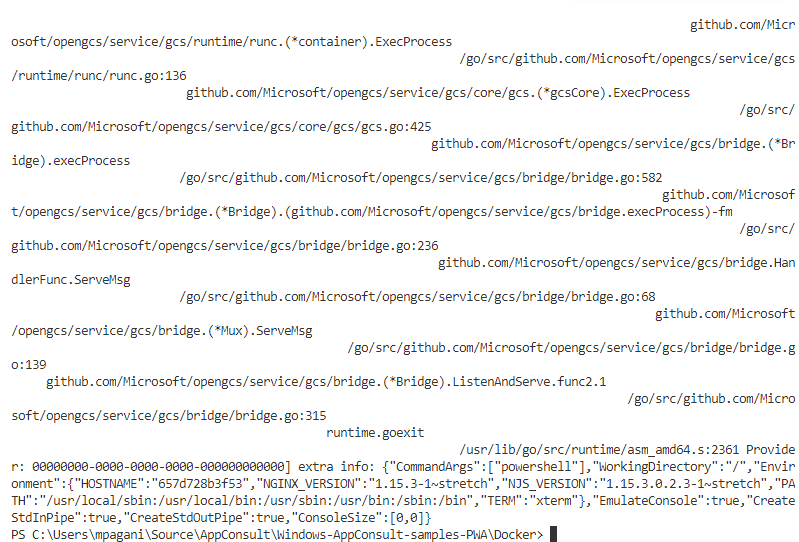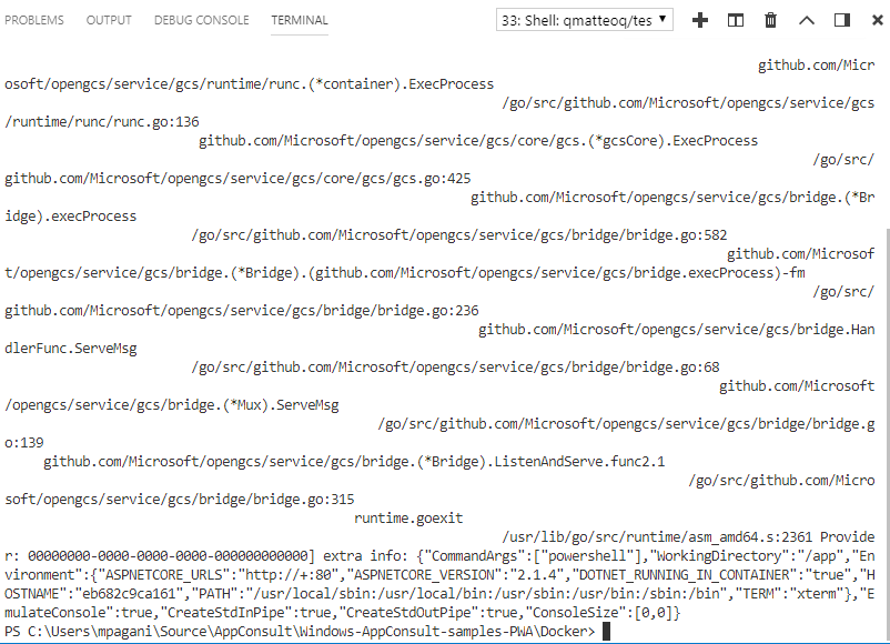 Well, this doesn't look good. The reason is that Visual Studio Code has tried to execute the same exact command we have seen with the IIS container, which means that we have tried to open a PowerShell terminal on a machine running Linux. Now it's pretty clear why it didn't work 😃