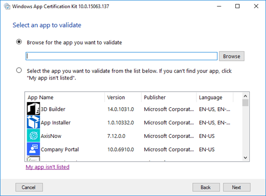 - Browse your hard disk to look for the AppX of the application you want to validate.