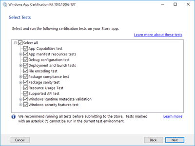 No matter which is the approach, you’re going to use, you will be presented with the set of tests that will be executed. You can immediately identify that the WACK is now able to properly recognize an app converted with the Desktop Bridge, because it will propose a set of tests different than the ones that are performed on full Universal Windows Platform apps. The below image shows, on the left, the tests that are executed on a Desktop Bridge app; on the right, instead, the ones that are proposed on a regular UWP app.