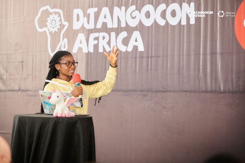 MVP Ariane Djeupang presenting at DjangoCon Africa