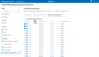 AccelNet isn’t just about enabling SR‑IOV, it’s about making it simple, scalable, and consistent across your cluster. Traditionally, configuring SR‑IOV meant manual cumbersome setup for every NIC: driver checks, NIC SR-IOV support, consistency validation across the cluster, etc. which was a process prone to errors and drift. To solve this, Accelerated Networking comes with a guided Windows Admin Center experience and matching PowerShell cmdlets. You can enable AccelNet across a cluster in a few clicks, verify which hosts and VMs are enabled, and troubleshoot with clear, actionable checks.