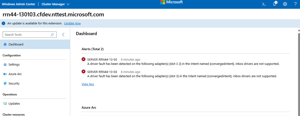 - Windows Admin Center (WAC): Navigate to the top right corner of your WAC Cluster Manager view and click on the bell icon to view alerts and faults.