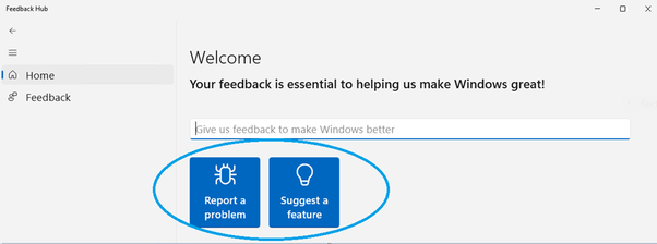 - From the ‘Home’ section of the app, click the “Report a problem” or “Suggest a feature” button.