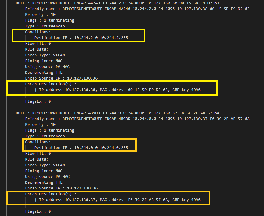 In overlay, inter-node connectivity is implemented using "REMOTESUBNETROUTE" rules in VFP. Instead of checking static routes, we can reference "REMOTESUBNETROUTE" rules directly in vfpoutput.txt, where each pod subnet (e.g. 10.244.2.0/24) assigned to a node should have its corresponding destination IP (e.g. 10.127.130.38) specified as the destination in the outer packet: