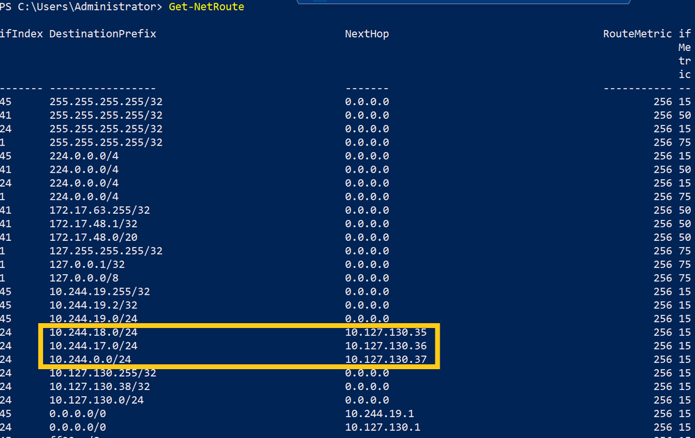 Get-NetRoute output highlighting static routes for pod networks