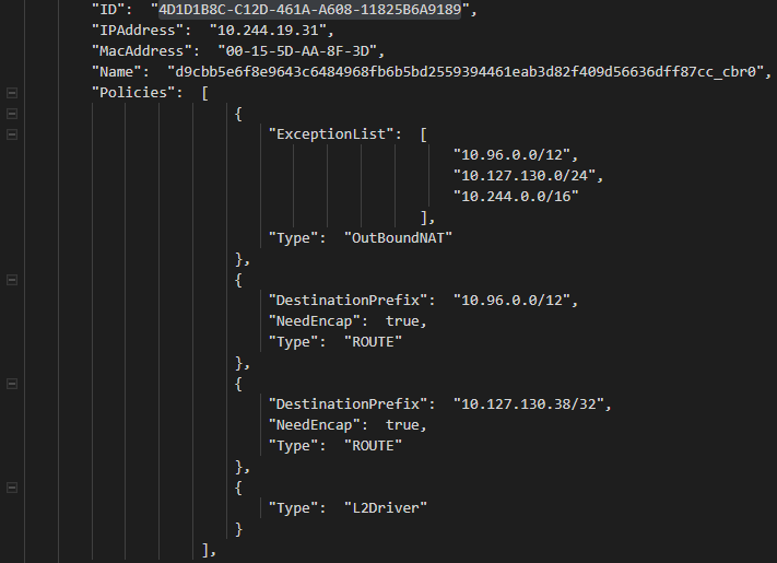 The next thing to check on l2bridge is verify that the OutboundNAT policy and the ExceptionList is programmed correctly. For a given endpoint (e.g. 10.244.4.7) we should verify in the endpoint.txt that there exists an OutboundNAT HNS Policy and that the ExceptionList matches with what we entered into the deployment scripts originally: