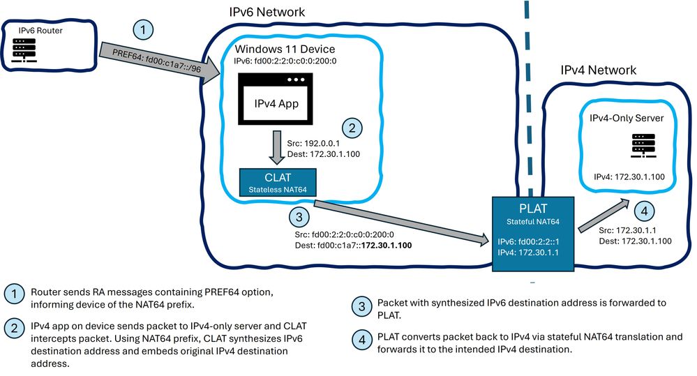 - IPv6-only connectivity: When the Windows client device initializes its network interface, it may find that no native IPv4 connectivity is available. Or, during DHCPv4 negotiation, the network may send Option 108, signaling that the host can operate in IPv6-only mode temporarily. While DHCPv4 Option 108 (RFC 8925) does not provide a NAT64 prefix, it indicates IPv6-only preference. This triggers the system to consider IPv6-only operation.