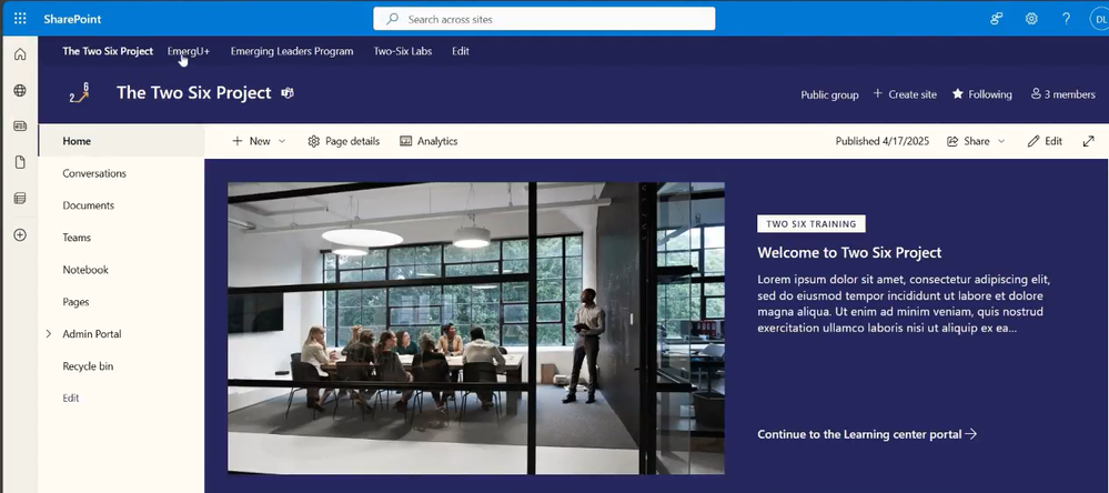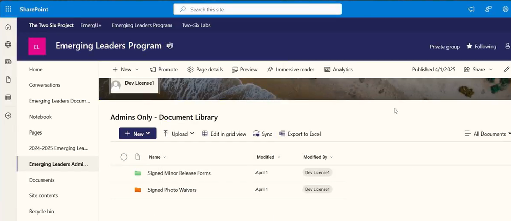 In the Two Six Project, a nonprofit needed a centralized hub for multiple educational programs. Each program received its own SharePoint site, connected under a single hub site. This allowed for unified navigation, consistent branding, and easy access to program-specific resources like waiver forms, curriculum documents, and announcements.