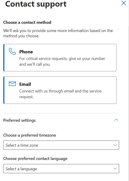 Choose your preferences: preferred contact method, preferred time zone, and preferred contact language.