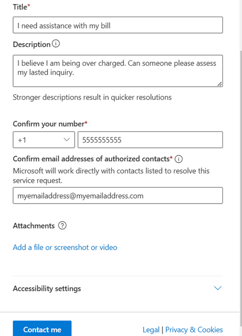 Fill in your details and give a strong description of your problem for a quicker resolution. You can add a file, a screenshot, or a video for added support. Once you’ve filled out the details, select Contact me at the bottom.