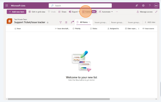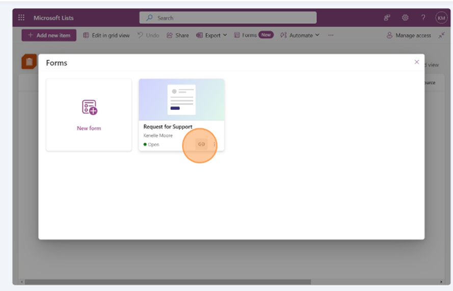 Now that your form and list are created you can test out your new form and ticket portal. Grab the link to your new form by selecting the forms button again in the menu. Select the link sign to copy the link.