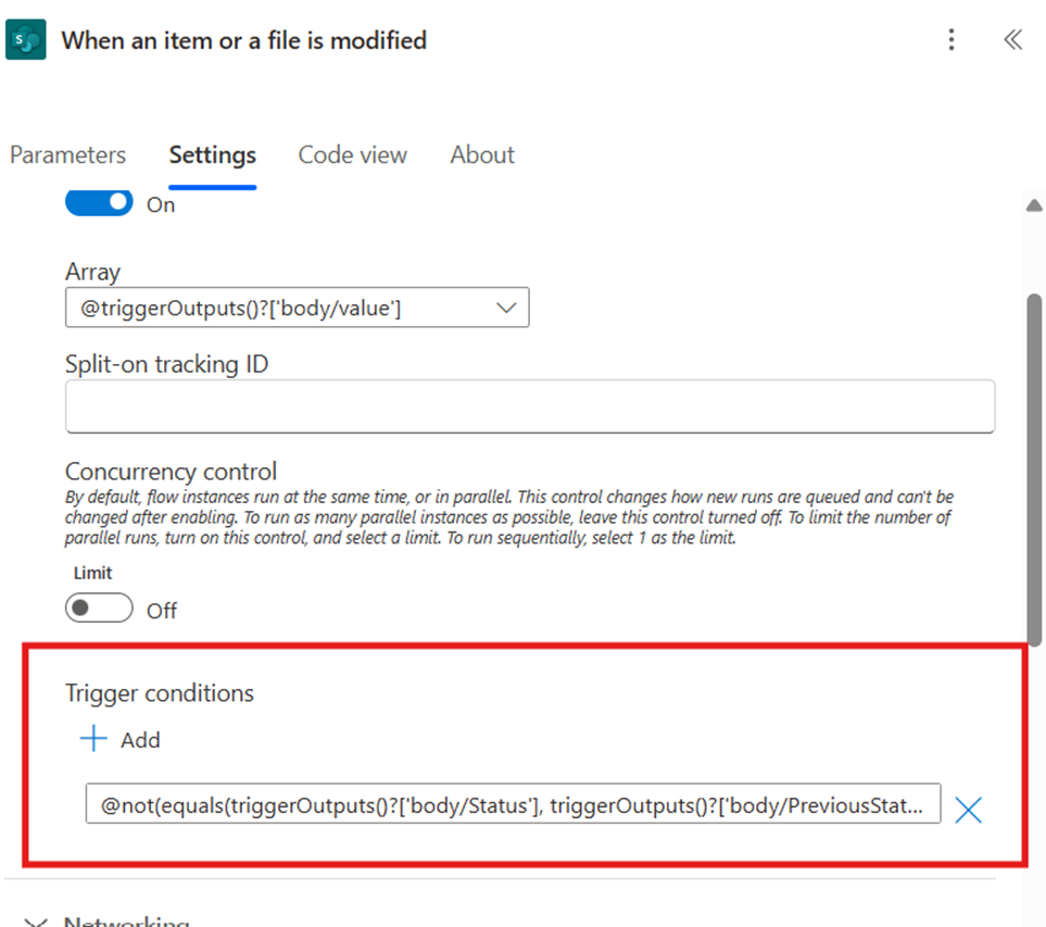 NOt(equals(triggerOutputs()?['body/Status'], triggerOutputs()?['body/PreviousStatus']))