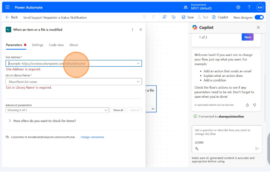 - On the canvas, select the trigger to enter the required data. The site address your Microsoft List is attached to and the list or library name.