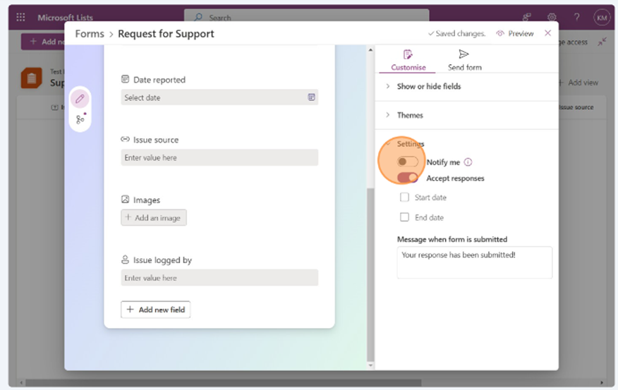 - In the form settings, select the toggle next to "Notify me" so that whenever a new item (support ticket) is submitted, you are immediately notified. This ensures that you don't miss an urgent request.