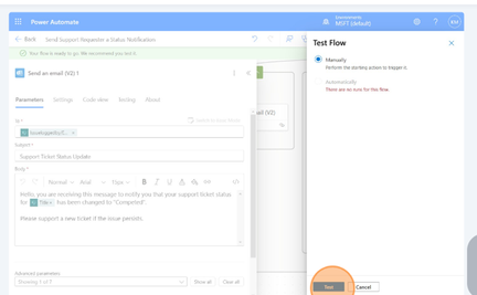 - Select Test and choose Manually. This specific flow is triggered when the status column has been modified to “In Progress” or “Completed”. Test both separately to make sure both works. You will see green check marks and receive a notification to the email you provided earlier when filling out the form with sample data.