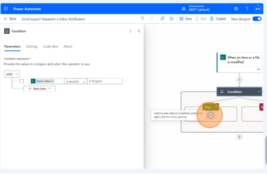 - We want to make sure the condition states “Status Value is equal to In progress”. (Capitalization matters here so make sure the capitalization of “In progress” matches the way it is spelled on your Microsoft List”.