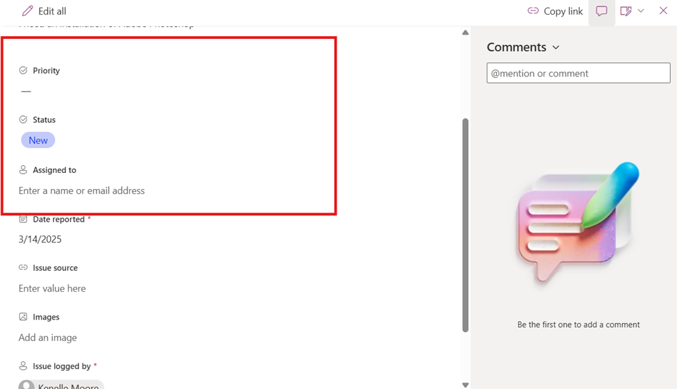 - Review the list items from the template and customize the list to what your organization needs. Include columns that capture essential details such as issue description, priority level, assigned to, and status.