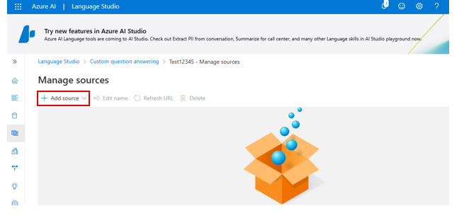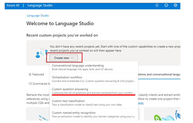 - In the Create new menu, select "Custom question answering."