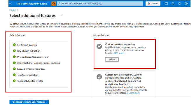 - Custom features: Select custom question answering.