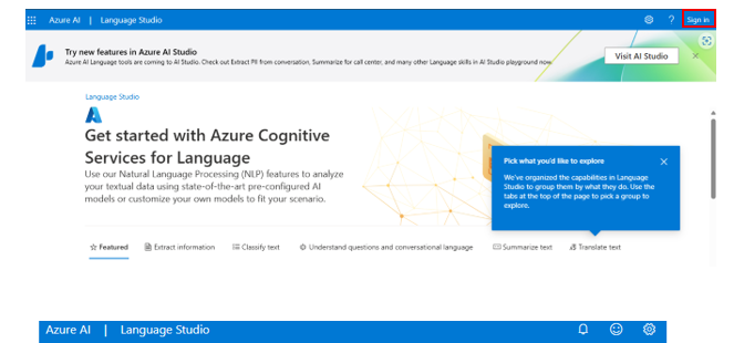 - Open the Language Studio portal at Language Studio - Microsoft Azure and sign in with your Microsoft account.