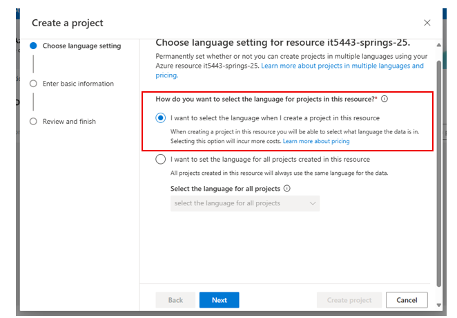 - On the Choose language setting for resource page, select "I want to select the language when I create a project in this resource" and click Next.