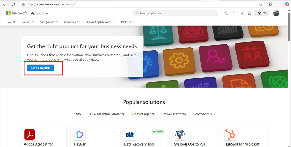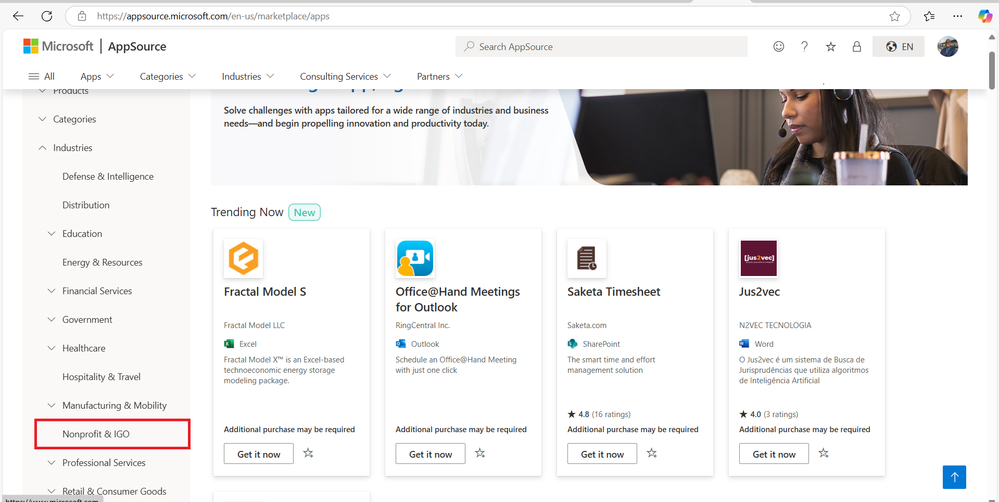 • Explore the Marketplace: Visit Microsoft AppSource and use the search and filter options to find solutions tailored to nonprofit needs. You can browse by category, industry, or specific Microsoft product integration.