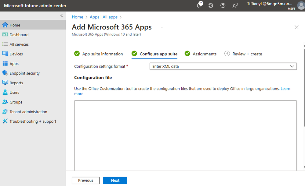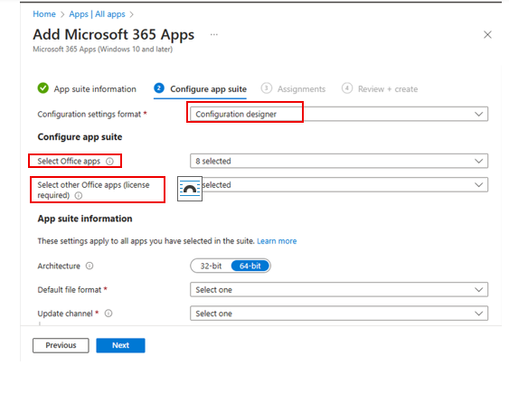 Intune allows you to configure the Microsoft 365 app suite to meet your organization’s needs. You can use the configuration designer or XML data to customize the installation: