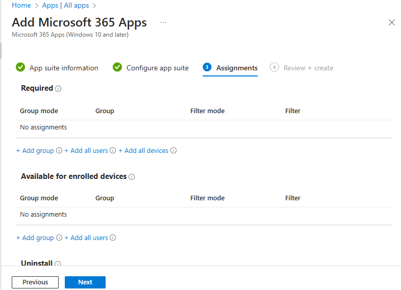 1. Select the Required, Available for enrolled devices, or Uninstall group assignments for the app suite. For more information, see Add groups to organize users and devices and Assign apps to groups with Microsoft Intune.