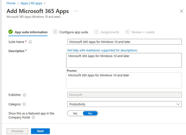 4. App Suite Information: In this step, you will provide information about the app suite. This information helps you to identify the app suite in Intune, and it helps users to find the app suite in the company portal. In the App suite information page, you can confirm or modify the default values: