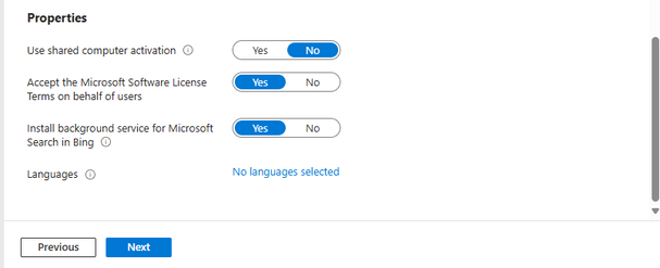 - Languages: Office is automatically installed in any of the supported languages that are installed with Windows on the end-user's device. Select this option if you want to install additional languages with the app suite.
