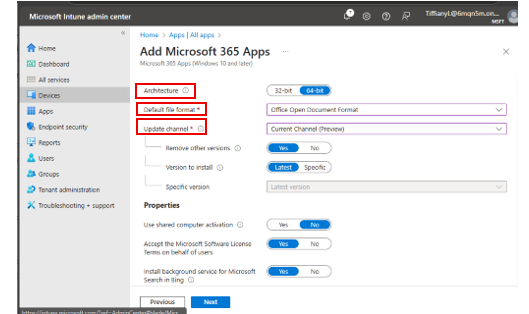 - Architecture: Choose whether you want to assign the 32-bit or 64-bit version of Microsoft 365 Apps. You can install the 32-bit version on both 32-bit and 64-bit devices, but you can install the 64-bit version on 64-bit devices only.