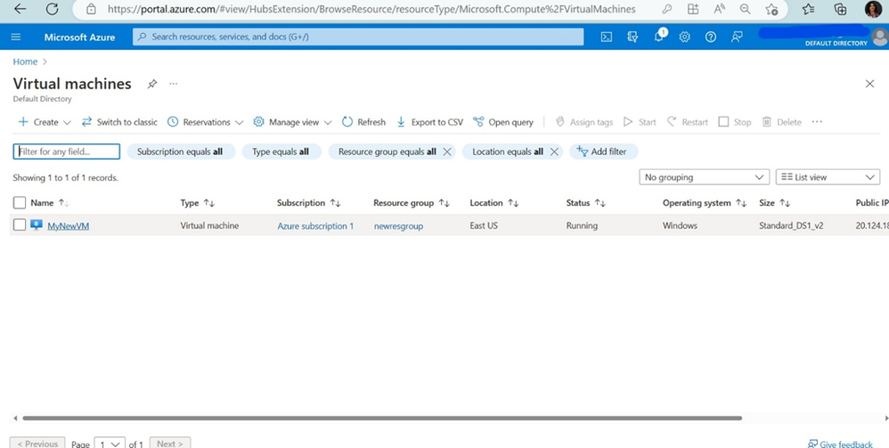 Step- 3: You will see the list of VM’s created in your Azure subscription. It will show the VM name, Type, Status, Resource Group, Location, etc. If you don’t have one you can create a new VM.
