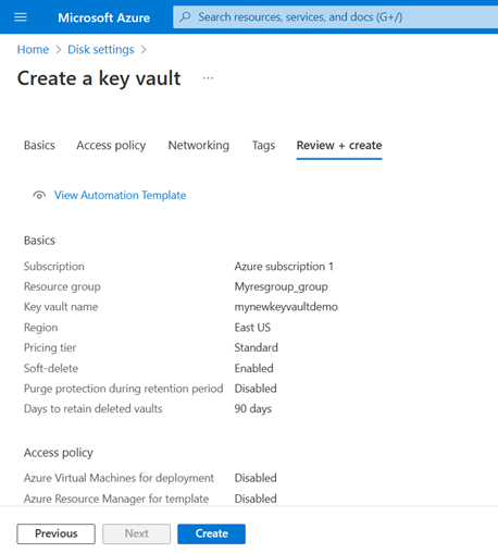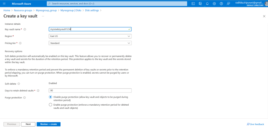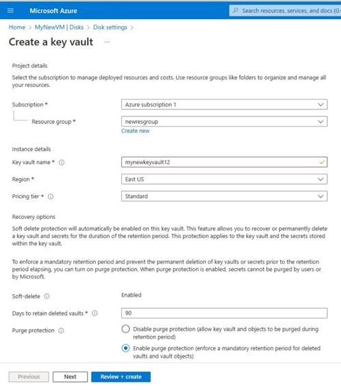 Next to Purge protection you can either enable it or disable it. For this article we are going to disable it.