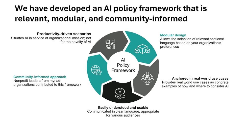 Chart showing AI policy framework based on producivity-driven scenarios, community-informed approach, modular design, easily understood and usable, and anchored in real-world use cases.