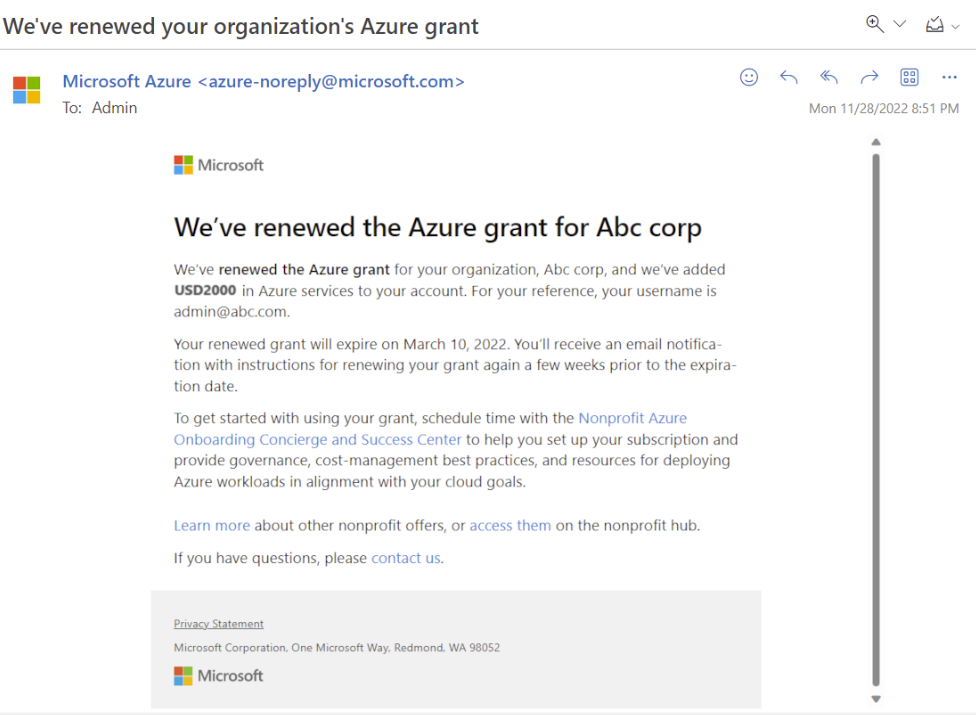 - Once you have renewed your sponsorship you will receive an email sent to your Microsoft Nonprofit Account. Make sure to check your Outlook inbox and spam folder for the notification email.