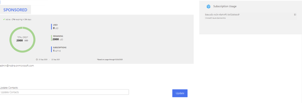 - You can also see the usage details as well for your subscription. This is a good way to check the costs being deducted from your sponsorship. If you need more in depth tools you can use Azure's Cost management tools inside the Azure portal.