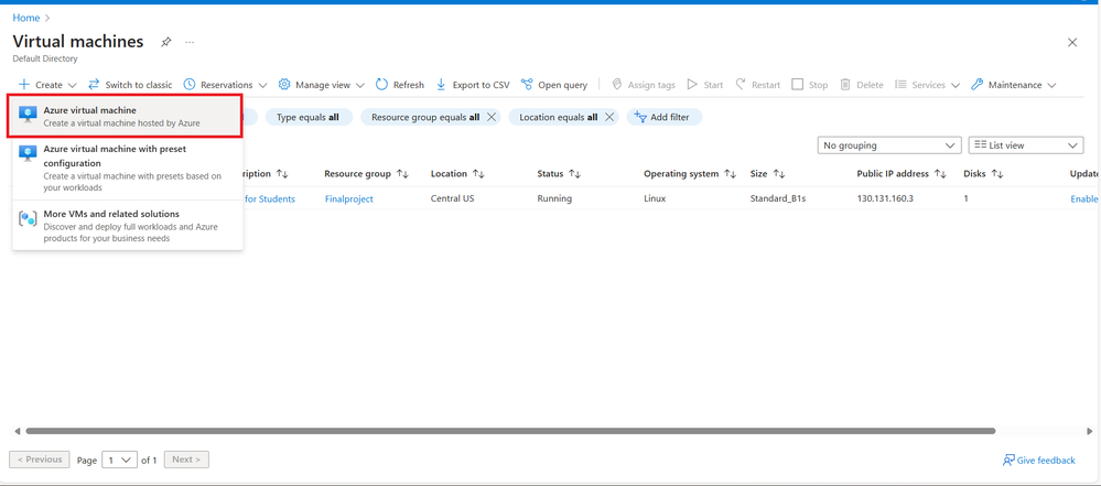 - Click on "Create" and then "Azure virtual machine".