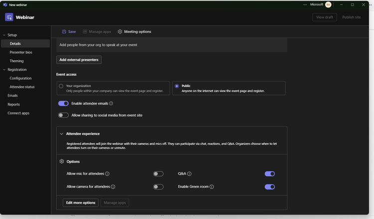 Set Meeting Options: Configure the meeting options such as mics, Q&A. Click on Edit more options to control who can bypass the lobby, Production Tools and other settings to ensure a smooth webinar experience.