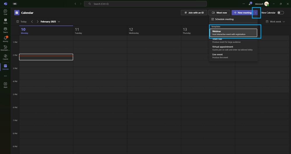 - Create a New Webinar: Click on the arrow next to "New meeting" and select "Webinar" from the dropdown menu.