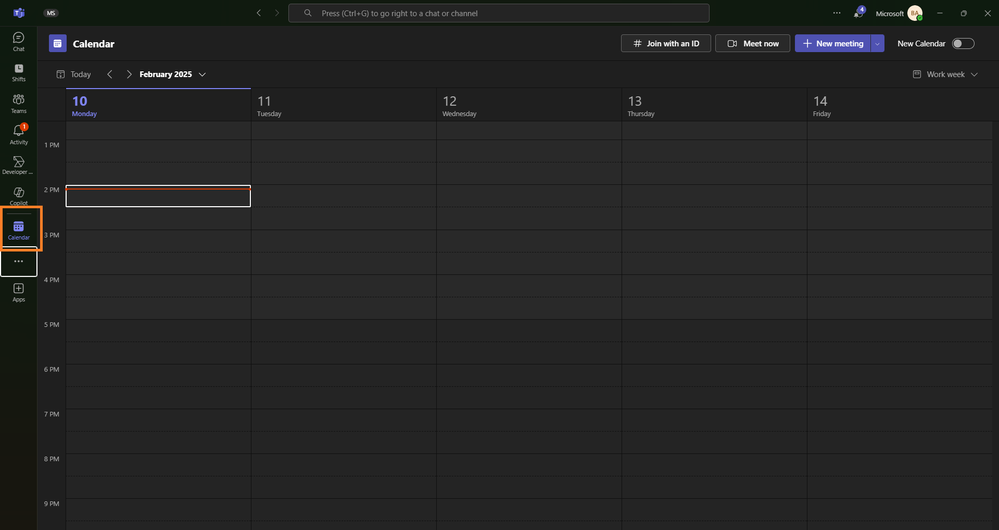 - Navigate to the Calendar: Click on the Calendar icon on the left-hand side of the Teams interface. If the Calendar option is not visible, click on the three dots (ellipsis) on the left-hand side to access additional applications.