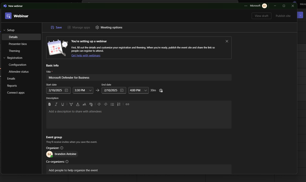 - Add Co-organizers: Specify who will help you manage the webinar